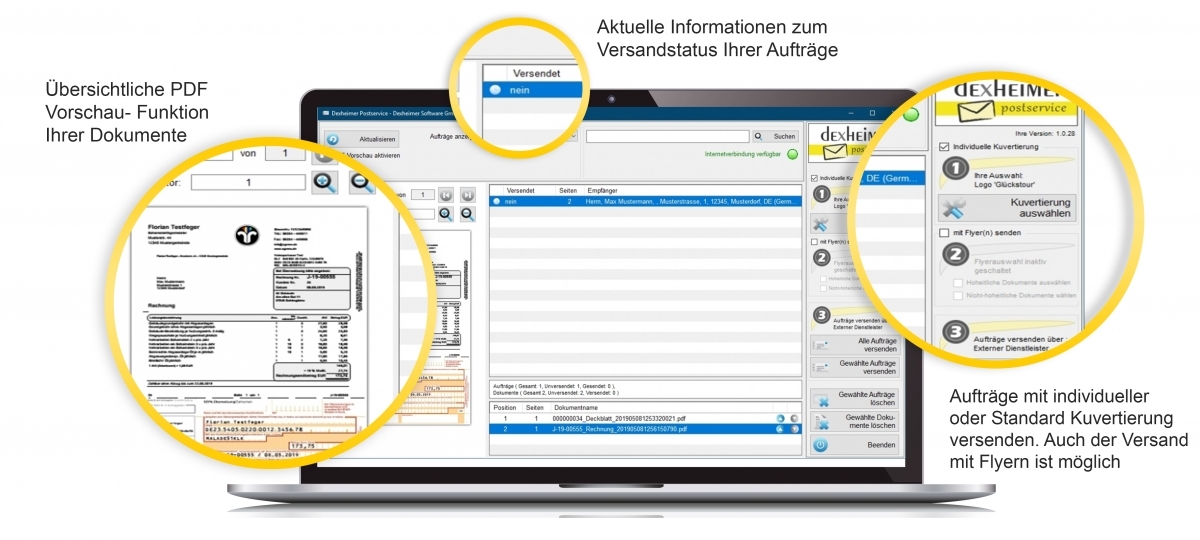 Sie starten einen Druckvorgang (Rechnung, Messbescheinigung, etc.) und klicken im Druckdialogfenster lediglich auf die Schaltfläche "dexheimer postservice".